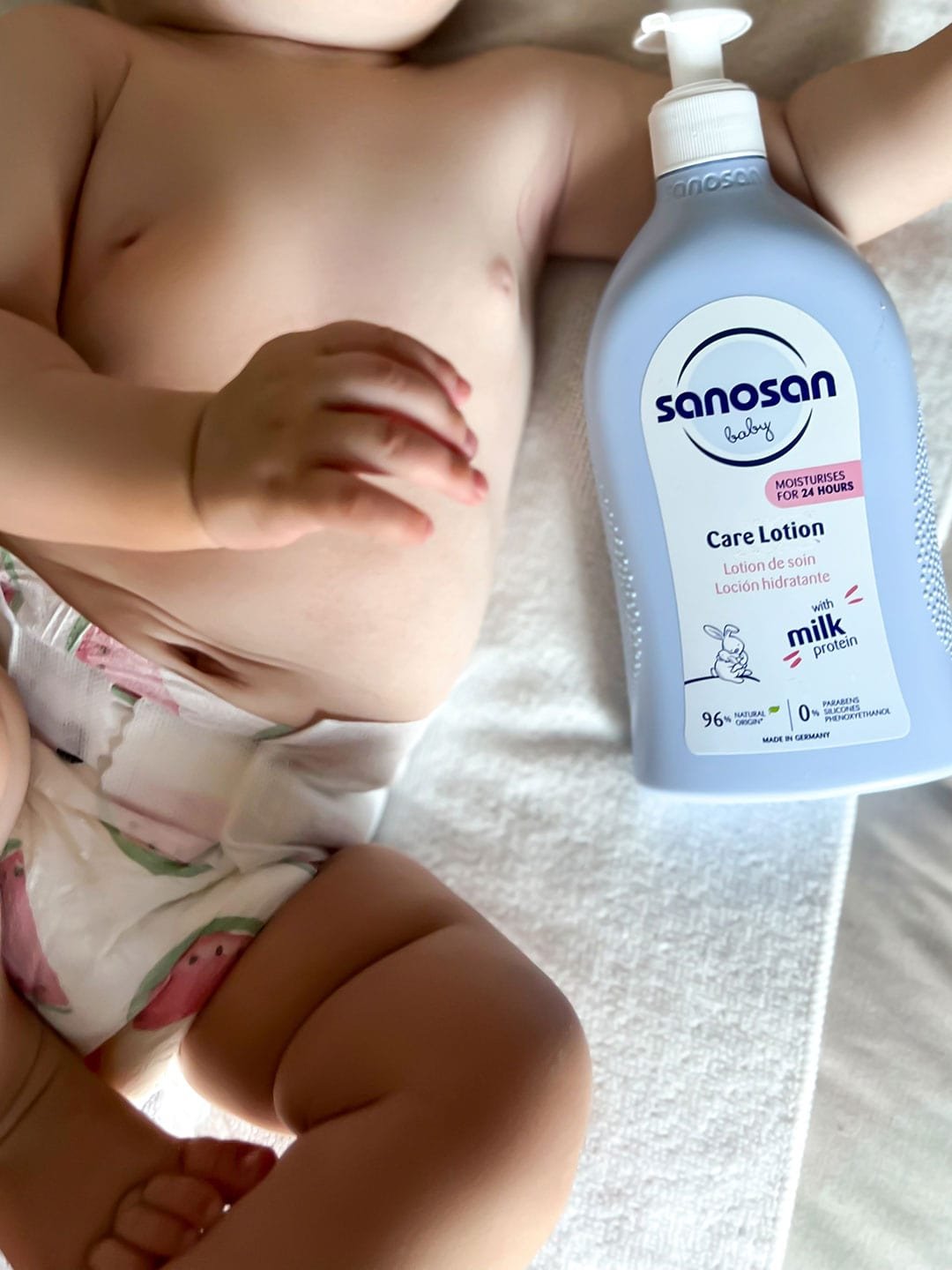 يحتوي لوشن العناية من سانوسان أيضًا على البانثينول والبابونج. كلاهما له تأثير مهدئ على بشرة الطفل ويُستخدمان تقليديًا في العناية بالأطفال.